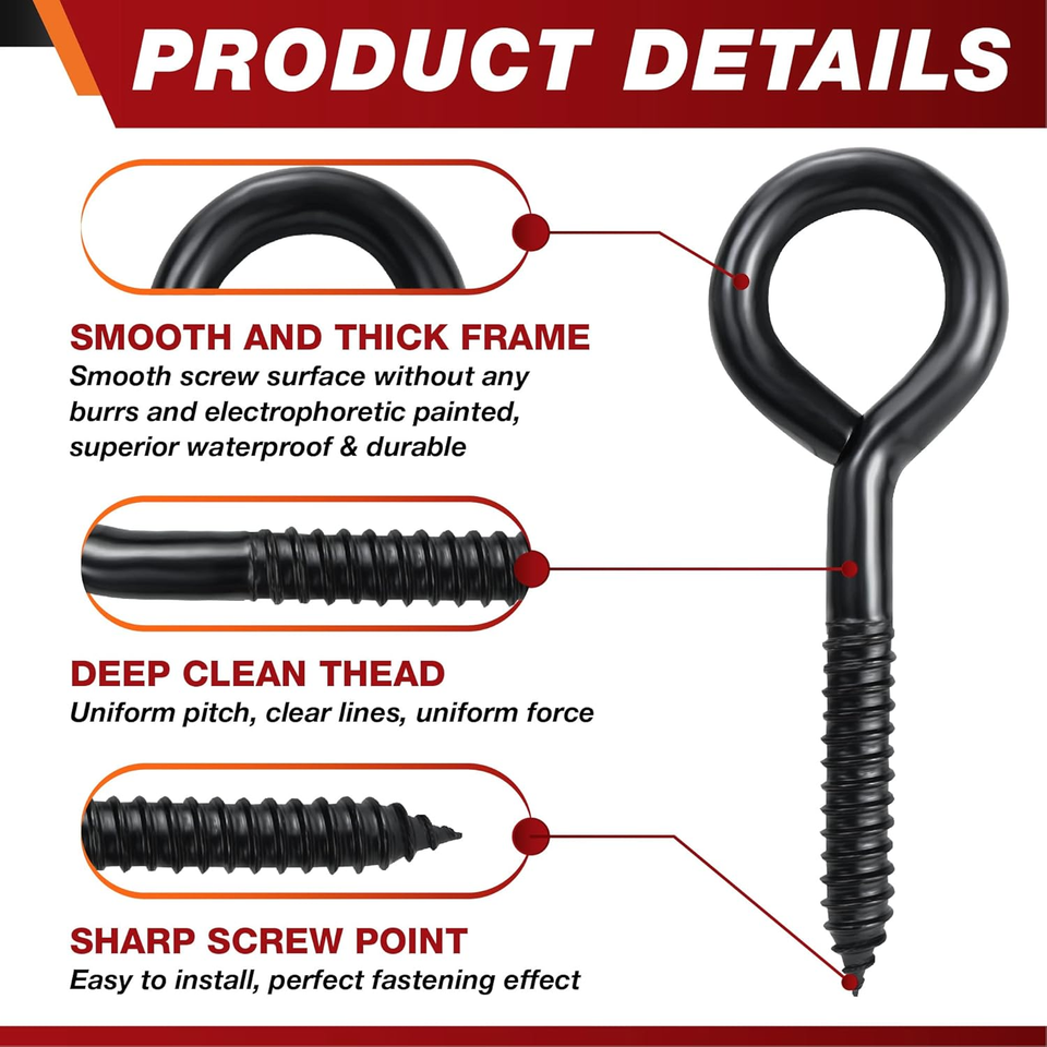 VERSATILE USAGE: These eye hooks are perfect for a variety of applications, both indoors and outdoors. Whether you're looking to hang swings for children, secure hammocks, or implement heavy-duty tie-downs, these screw eyes deliver exceptional performance. Their stylish black finish not only adds a touch of elegance to your projects but also makes them suitable for decorative purposes in home improvement tasks. From camping adventures to DIY projects, these eyelet hooks are designed to meet your diverse needs.