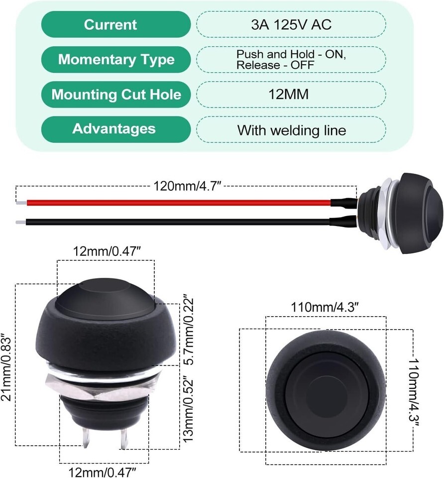 6 Pcs Waterproof 12mm Momentary Push Button Switch with Pre-Soldered Wires ? ? ? ? ? ? ? ? ? ? ? ? ? ? ? ? ? ? 6 Pcs Waterproof 12mm Momentary Push Button Switch Unleash the power of precision with our premium momentary push button switch set, designed for superior functionality and versatility. Product Features: Momentary Type: Push and hold - ON, release - OFF for seamless operation. Pre-wired design: Effortlessly install with pre-soldered wires, saving you valuable time and costs. Compact Design: Mounting cut hole of 12mm; head diameter of 17.5mm fits perfectly in any project. Reliable Performance: Switch rating of 3A/125V AC, ensuring high conductivity and durability. Low Contact Resistance: 20M? for enhanced performance and minimal electrical loss. Beautiful Aesthetic: Elegant black finish that complements any environment or device. Package Includes: 6 Black Reset Switch Push Button Why Choose Our Push Button Switch? Elevate your electronic projects with our waterproof momentary push button switches, designed for professionals and hobbyists alike. With a focus on ease of installation and unmatched reliability, these switches will serve as the backbone of your circuitry. The sleek design allows you to incorporate them seamlessly, whether for DIY projects or professional applications. Don't compromise on quality?opt for our superior switch set that prioritizes performance and longevity. Order now to experience the ultimate in functionality! Shipping Free Fast Shipping - We offer free shipping to most of the USA with a normal delivery time of 3-7 days. However, due to the current situation, additional delivery time (up to 3 weeks) may be required for some items. Alternative Carriers - We may use alternative carriers (e.g. USPS, FedEx, UPS, etc.) to ensure your package arrives safely and on time. Due to the use of multiple carriers, we are unable to provide a tracking number automatically. Handling Time - Orders are processed and shipped within 1-2 business days of receiving cleared payment. Shipping Restrictions - Shipping to Alaska, Hawaii, Puerto Rico, Guam, and other US territories may incur shipping charges or delivery restrictions. Please contact us before ordering, or your order can be refunded/cancelled. State Restrictions - There may be restrictions based on your state of purchase. For example, certain items may not be shipped to California due to state regulations. Contact for Tracking Updates - If you require tracking updates or have any concerns about the delivery of your order, please feel free to contact us, and we will be happy to assist you. Return 30-Day Hassle-Free Returns - We want you to be completely satisfied with your purchase. If you are not, you can return the item within 30 days of receiving it for a full refund or exchange. Easy Return Process - To start a return, simply contact us and we will provide you with a prepaid return shipping label and detailed instructions. Restocking Fee - There are no restocking fees for returns. However, the buyer is responsible for return shipping costs if the return is not due to a seller's error. Refund Processing Time - Refunds will be processed within 5 business days of receiving the returned item in its original condition. Payment We accept all major credit cards, PayPal, and Apple Pay for your convenience. Your payment information is secure and encrypted to ensure a safe and seamless transaction. Please complete your payment within 3 days of purchase to avoid any delays in shipping. Feedback Your feedback is extremely important to us. We strive to provide the best products and customer service possible. If you are satisfied with your purchase, please take a moment to leave us a positive review. If you have any concerns or issues with your order, please contact us before leaving negative feedback. We are committed to resolving any problems and ensuring your satisfaction. Contact Us If you have any questions or concerns, please feel free to reach out to our customer support team. You can contact us through the messaging system. We are available Monday to Friday, 9:00 am to 5:00 pm EST, and we will do our best to respond to your inquiry within 24 hours. Buy it now and enjoy a pleasant shopping experience! UPC: Not Set Model: Push Button Switch Unit Quantity: 6 Features: Waterproof,Pre-wired design,Easy to install,On-Off operation Contact Material: Silver Application: Electronics,Home Appliance Smart Home Protocol: Not Set Smart Home Compatibility: Not Set Suitable For: Interior Resistance Properties: Waterproof Mounting Style: Snap In Compatible Wire Gauge (AWG): Not Set Room: Any Room Protection Properties: Not Set Brand: Unbranded Fuse Type: Switch Type: Push Button Switch Operation Method: On/Off Termination Type: Weld Current Type: AC Finish: Not Set Switch Style: Push Button Maximum Amperage: 3 A Current Rating: 3 A Coil Voltage: Not Set MPN: Not Set Number of Positions: 1 Button Color: Black Number of Outlets: Not Set Number of Phases: Not Set Bulb Compatibility: Not Set Item Length: Not Set Item Width: Not Set Item Height: Not Set Number in Pack: 6 Contact Configuration: Normally Open IP Rating: IP54 Number of Circuits: Not Set Country/Region of Manufacture: Not Set Orientation: Not Set Power: Not Set Operating Temperature: Not Set Timer Control: Not Set Unit Type: Unit
