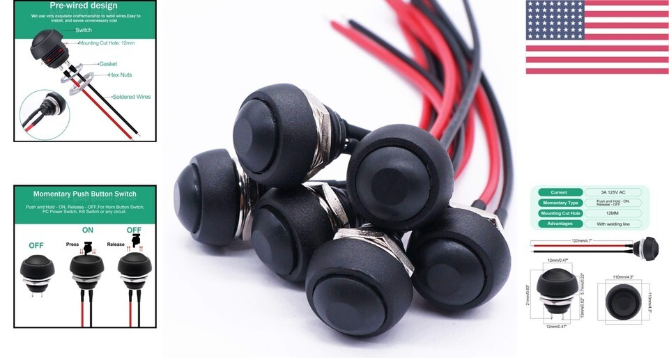 Primary image for 6 Pcs Waterproof 12mm Momentary Push Button Switch with Pre-Soldered Wires