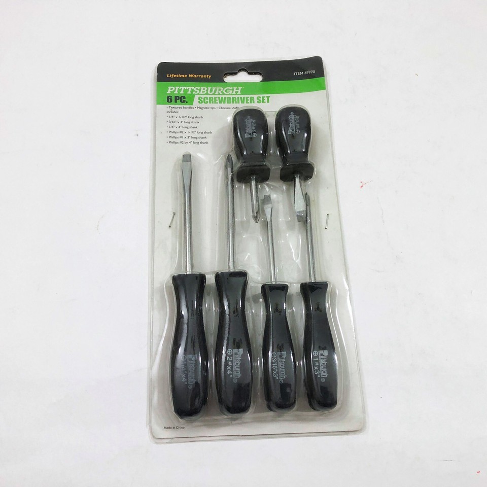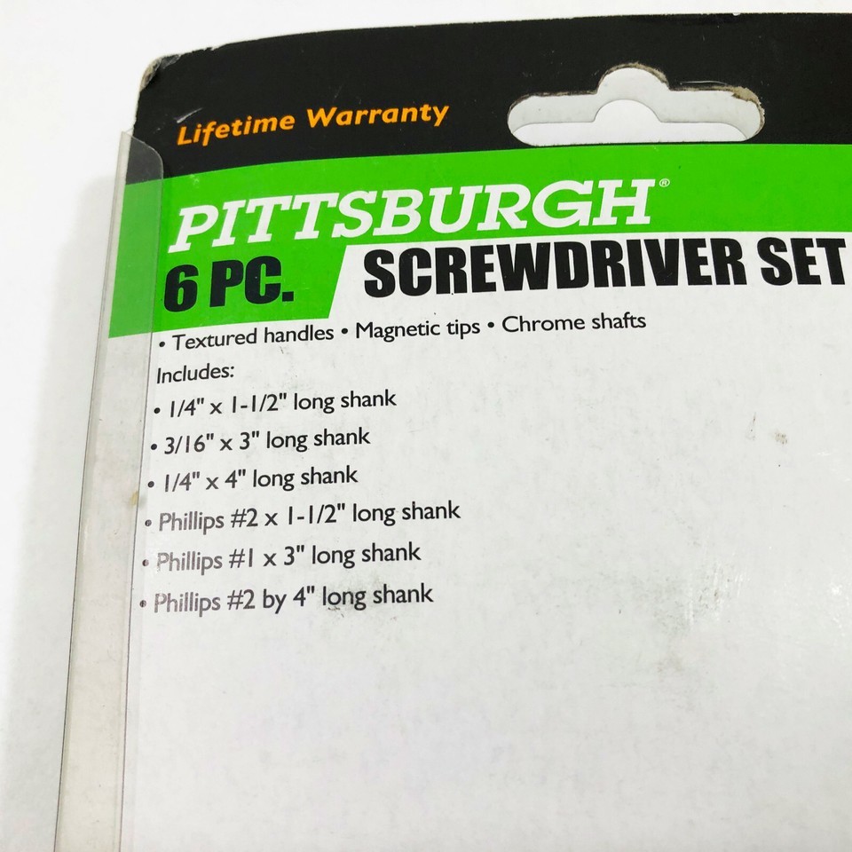 Pittsburgh, Green packaging Screwdriver set 6 Pieces Textured handles Magnetic tips Chrome shafts 1/4 x 1-1/2 " Long shank 3/16 x 3 " long shank 1/4 x 4 " long shank SKU AC-0-08-24-038