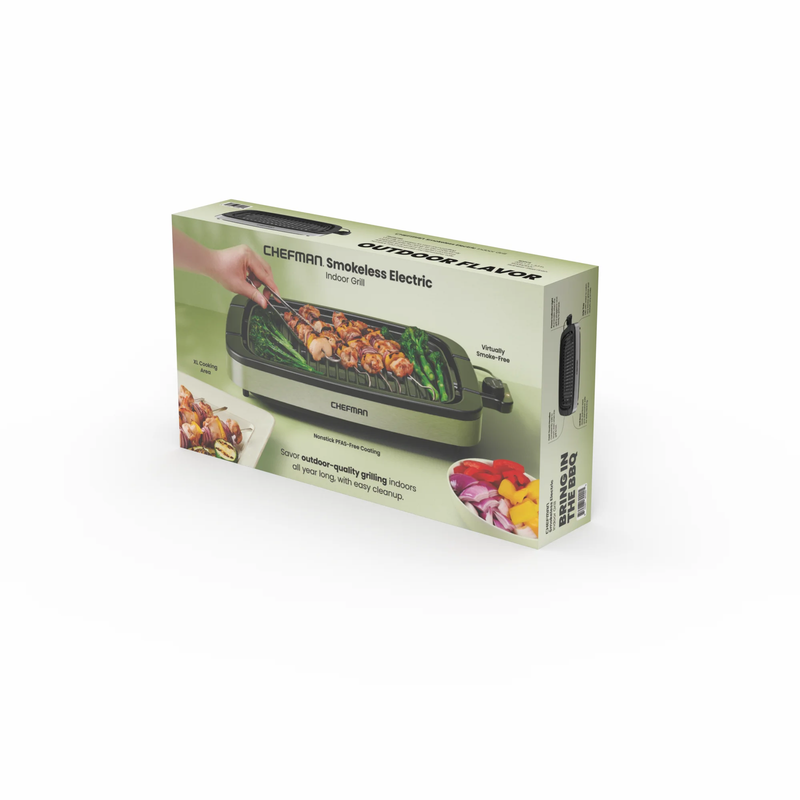 The Chefman Smokeless Indoor Grill turns your backyard grilling into high-end kitchen cooking. The water-filled drip tray allows for virtually smoke-free grilling inside, and the temperature-controlled heat gets dinner done just the way you like it. Make meals for a crowd with the extra-large cooking area and keep cleanup simple with the nonstick grate, dishwasher-safe base, and drip tray. Purchase includes a 1-year assurance from Chefman. 1500 Watts/120 Volts ? RJ23-SPG-SS - Stainless Steel New