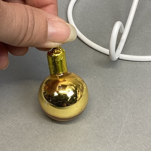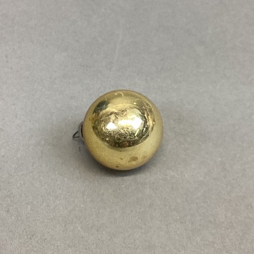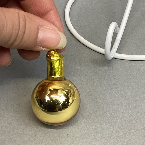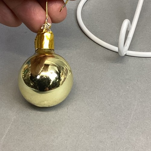 2. 3 gold ball ornaments. Miniature - 1.5?H, small - 2.25?H. Missing topper and medium - 2.5?H. Missing topper but has makeshift topper.
