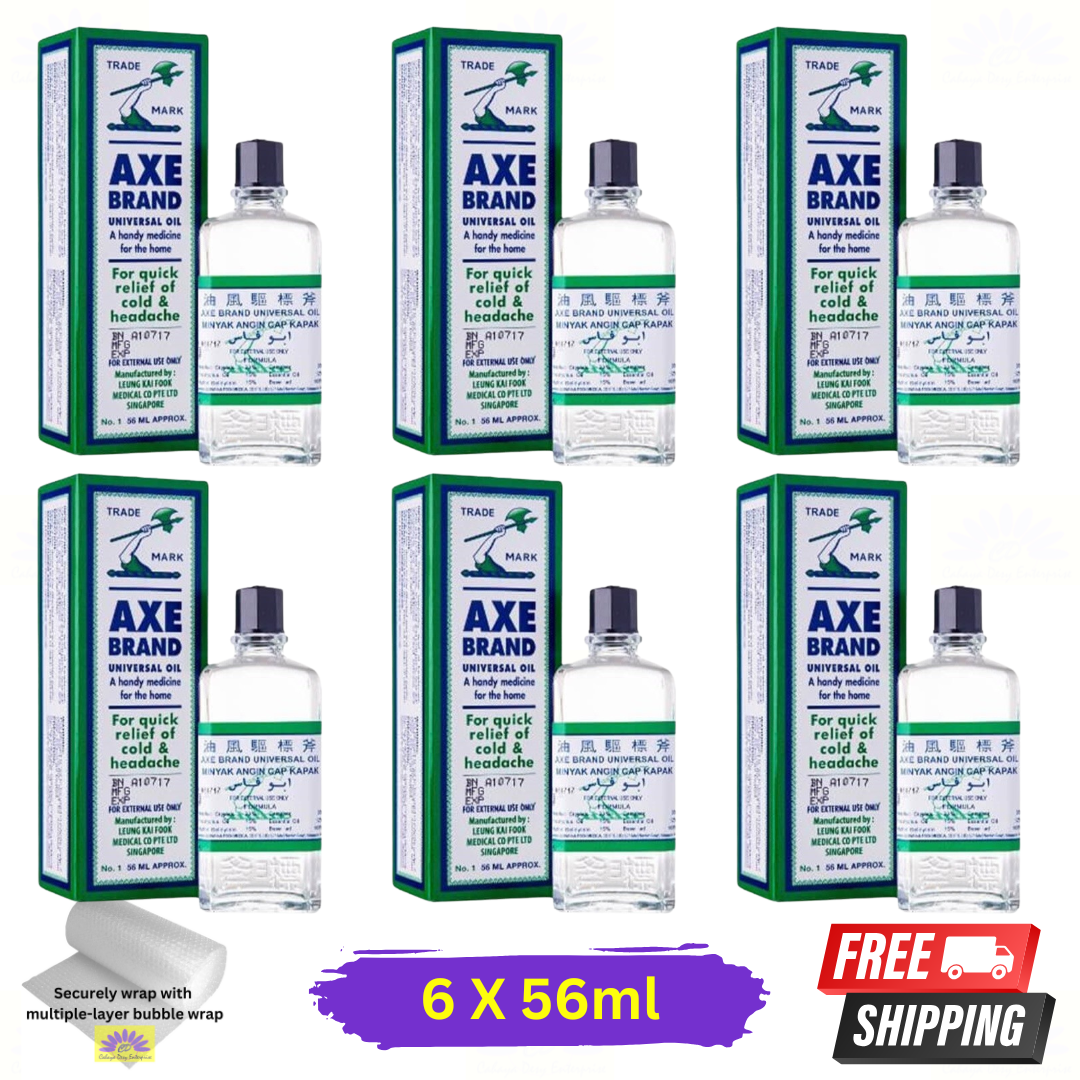 Stock up on relief with this 6-pack of Axe Brand Universal Medicated Oil (56 ml each)?a trusted, multi-purpose analgesic oil known worldwide for quick soothing of minor aches, colds, insect bites, and more. Compact and reliable, it?s a must-have for any household or travel kit.