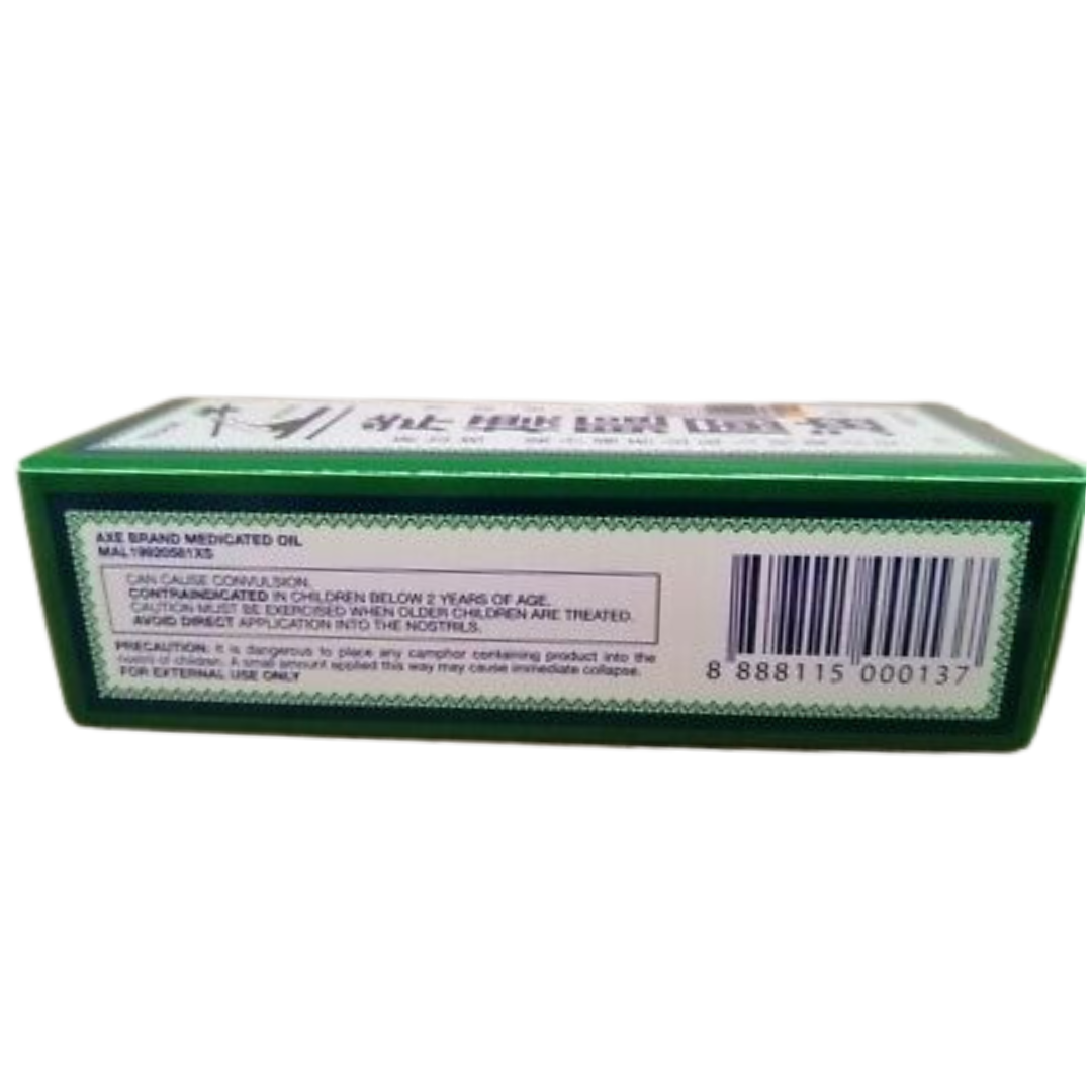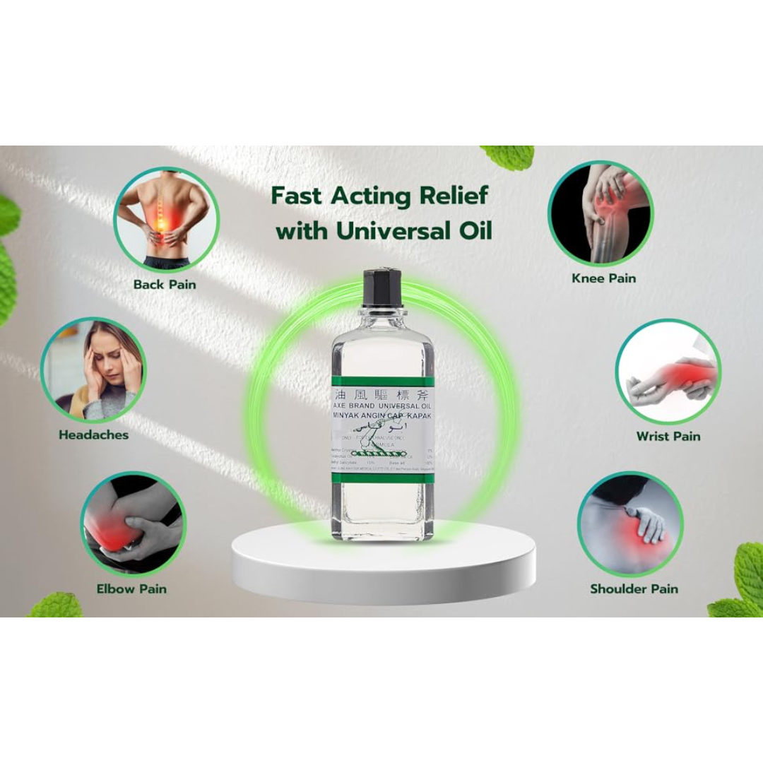 Stock up on relief with this 6-pack of Axe Brand Universal Medicated Oil (56 ml each)?a trusted, multi-purpose analgesic oil known worldwide for quick soothing of minor aches, colds, insect bites, and more. Compact and reliable, it?s a must-have for any household or travel kit. Rapid pain relief: Menthol, camphor, and methyl salicylate provide cooling and warming relief from headaches, muscle and joint pain, strains, backaches, and arthritis aches. Soothes common ailments: Eucalyptus and lavender oils help relieve nasal congestion, dizziness, stomach discomfort, and soothe insect bites. Multi-symptom versatility: Ideal for a wide range of everyday woes?from colds to tummy upsets to travel nausea. Adults children over 3 years: Apply a few drops to affected areas and gently massage. Rep