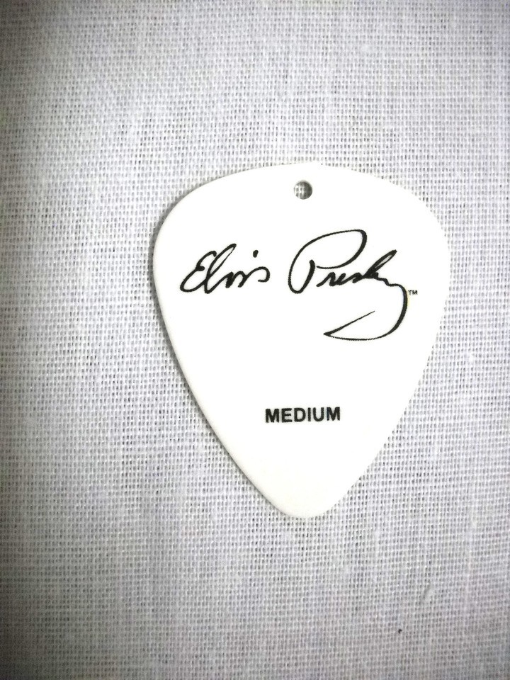 NEW KING ROCK ROLL in BLACK WHITE PHOTOGRAPH 1968 '68 SPECIAL FROM BROADCAST TV PRINTED FRONT ON WHITE GUITAR PICK PENDANT ELVIS PRESLEY AUTOGRAPH ON BACK SIDE (photo 2) - Authentic JIM DULOP Merchandise