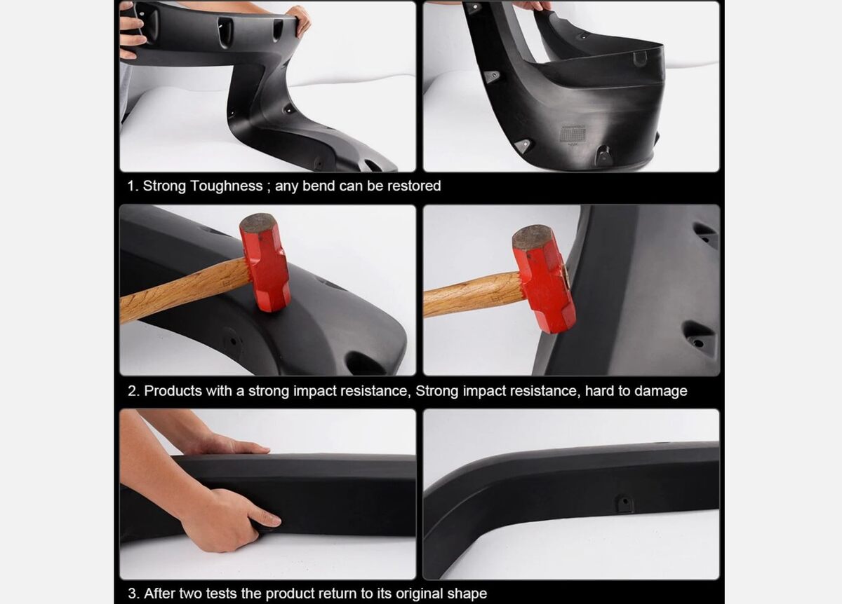 Product description: Product will be received exactly the same as shown in the picture! Four pieces set of pocket rivet style fender flares. (2 for front and 2 for rear) Made of high quality polypropylene in black finished. Ready to be painted. Full protection from mud scratches, sand and other outer damages for your wheels. Helps to reduce spray and protects paint with fender flares. Comes with bolts, nuts and all necessary mounting hardware for installation. Easy to install, no further modification to the body needed