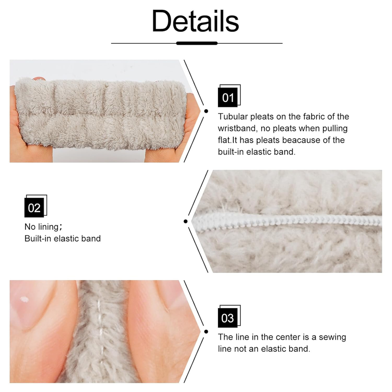 1. Tubular pleats on the fabric of the wristband, no pleats when pulling flat.It has pleats beacause of the built-in elastic band. 2. No lining. Built-in elastic band 3. The line in the center is a sewing line not an elastic band.