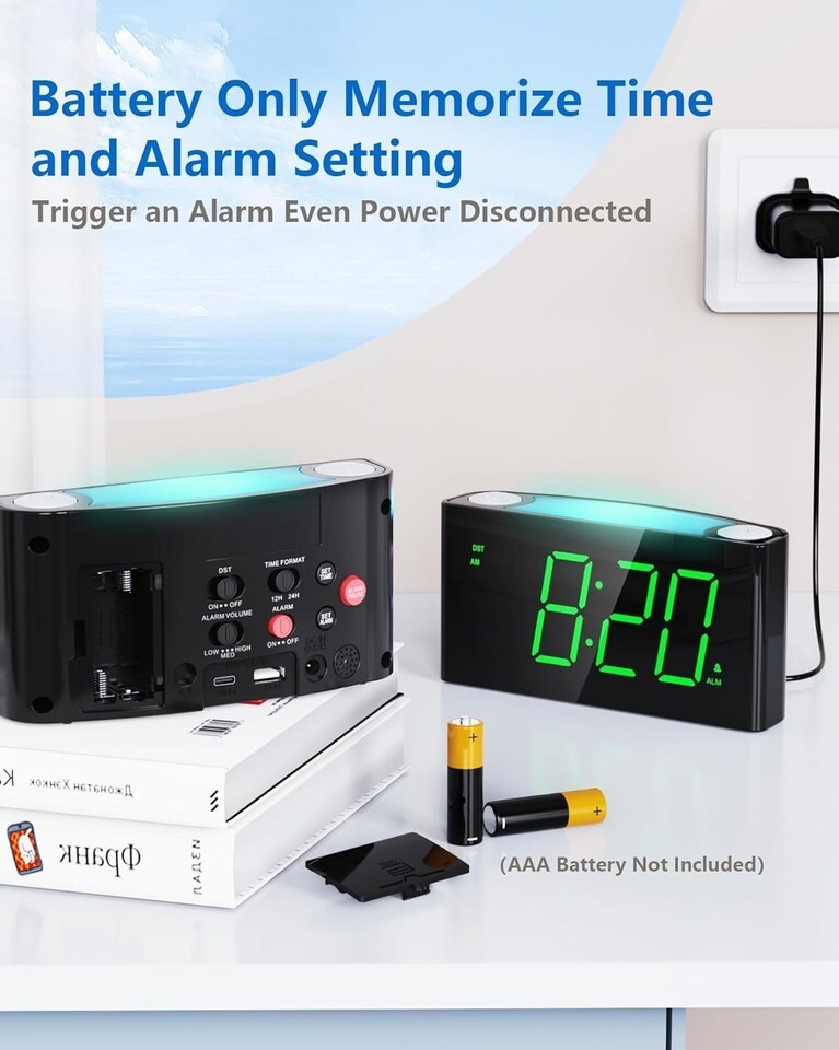 Plug-in Electric Battery Backup: This loud alarm clock requires a DC wall power outlet for all functions. Use 2 AAA batteries (not included) as backups to ensure alarms sound even during power failures.