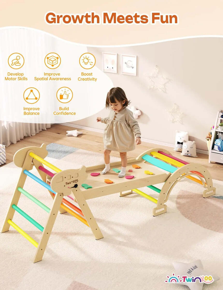 2. ??????-????? ????????????: The Twinkoo climbing set for toddlers are larger and made of thicker materials, ensuring enhanced stability and durability; All wood surfaces are polished to prevent injuries, providing a safe play environment; The frame undergoes rigorous testing to support up to 200 pounds, making it a reliable choice for your child's playtime activities