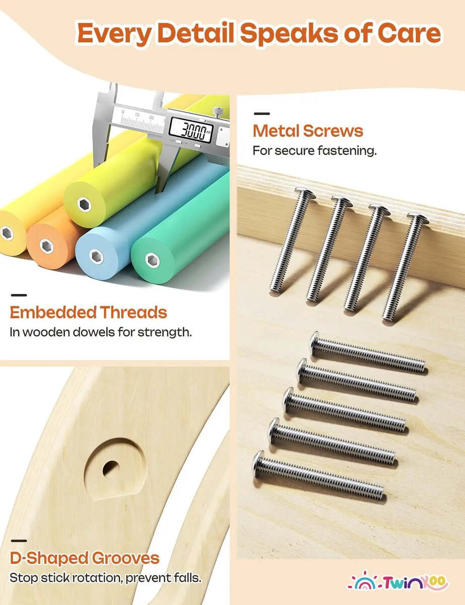 4. ?????????-??????? ???????: The Pikler Triangle features two airplane-shaped handholds and nine sticks on the arched ladder, ensuring balance while climbing; We have thickened the sticks to withstand more pressure, providing additional support; Each round stick has internal nuts and an external D-shaped groove, preventing rotation and enhancing safety