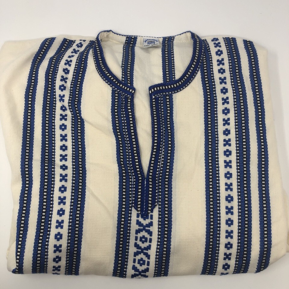 This Vintage 70s Greek Caftan Dress in Beige Blue is a handmade, one-of-a-kind piece that embodies a bohemian look from the 1970s. Made from a comfortable cotton blend material, this dress features a relaxed fit perfect for everyday wear. With a waist size of 43 inches and a women's size 4, this original Greek caftan is a unique addition to any vintage clothing collection.