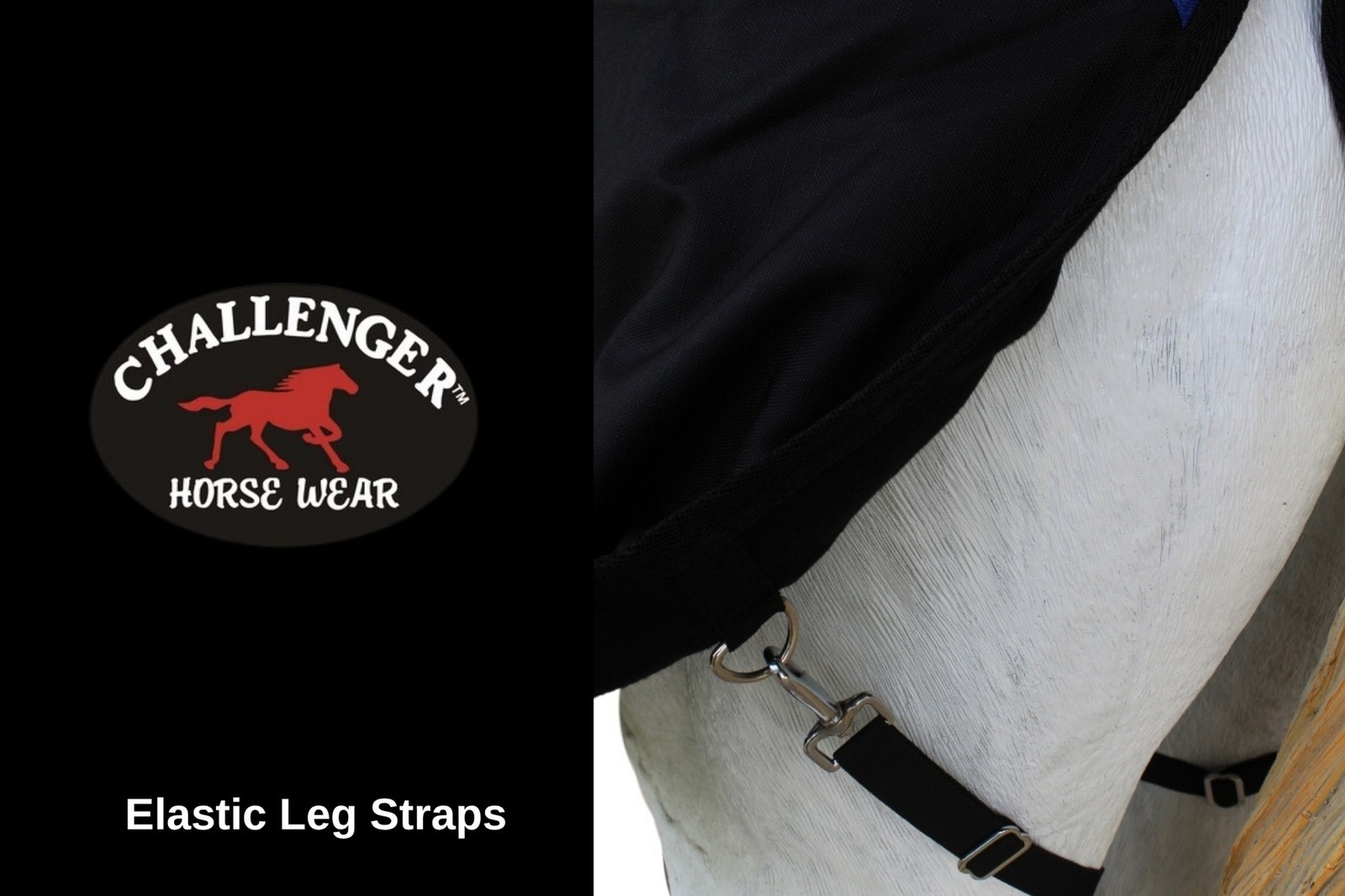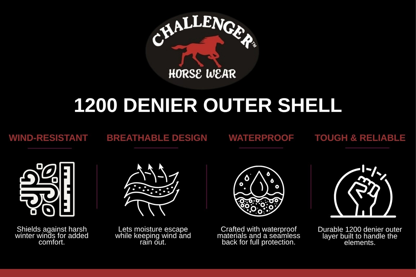 Challenger medium-weight horse blanket features a waterproof, breathable, and durable 1200D outer shell constructed with rip-stop weave fabric. Fleece lined underside to help keep your horse warm. The dual front buckle snap closure, cross surcingles, and elastic leg straps help secure blanket in place and ensure a comfortable fit. The reinforced, double-sewn stress points offer additional reinforcement to help prevent tears, while the fleece wither helps provide protection from rubbing. Shoulder gussets allow for freedom of movement. Tail cover provides additional protection from moisture. Hardware made of rust-free stainless steel.
