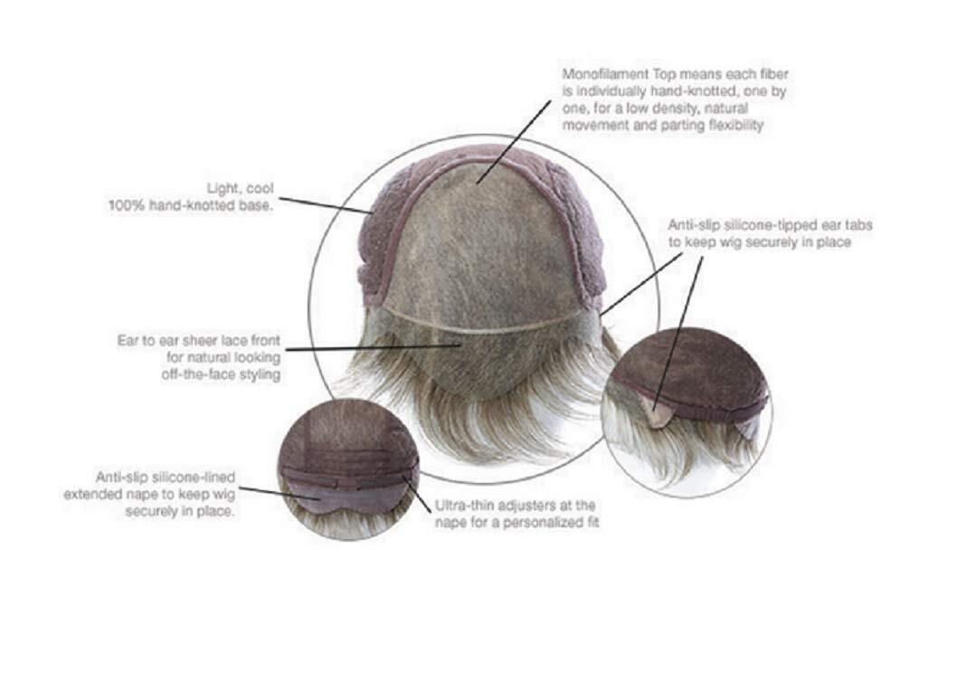 Due to the nature of this item governed by Health Code Laws, this item has return restrictions. Please review seller policy for more details. SPECIAL FEATURES Excelle Heat-Friendly Synthetic Hair - Can be styled with heat on low to medium settings 100% Hand-tied - Light, cool 100% hand-knotted base Monofilament Top - Each fiber is individually hand-knotted, one by one, for a low density, natural movement and parting flexibility Lace Front (Temple to Temple) - sheer lace front for natural looking off-the-face styling Silicone-Lined Ear Tabs - Anti-slip to keep the wig securely in place Siliconed Lined Extended Nape - Anti-slip to keep the wig securely in place Ultra-thin Adjusters at the Nape - For a personalized fit