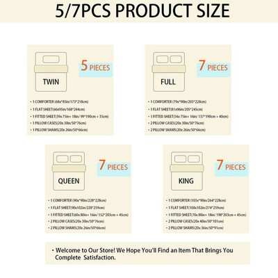 [Everything You Need]: 5/7 piece bed bag includes 1 comforter, 1 flat sheet, 1 fitted sheet, 1/2 pillow case, 1/2 pillow shams; This bed bag set is perfect for making any room your own A new look. Twin 173*218: 5 pieces, Full\Queen\King: 7 pieces.
