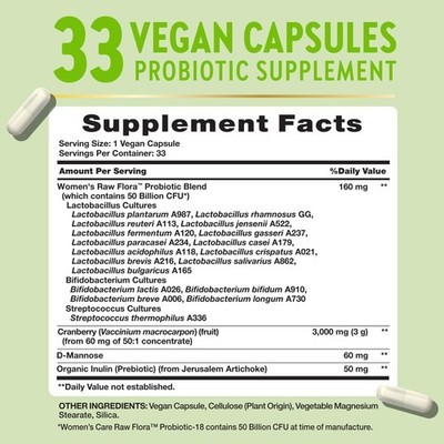 8/2026 Raw Flora Probiotics for Women | 50 Billion CFU | 33 Capsules | 3 BOTTLES Lot of 3 Bottles Expiration Date of 08/2026 Natures Truth Raw Flora Probiotic Women's Care contains 33 capsules in each box, totaling 66 capsules. These probiotic capsules are specifically formulated for women's health, providing support for general wellness and digestive health. Made by Nature's Truth, the active ingredient is probiotic, helping to maintain a healthy gut environment. With an expiration date of 8/2026, this supplement is designed to offer long-lasting benefits for women looking to improve their overall health and well-being. (description exceeds maximum possible length)