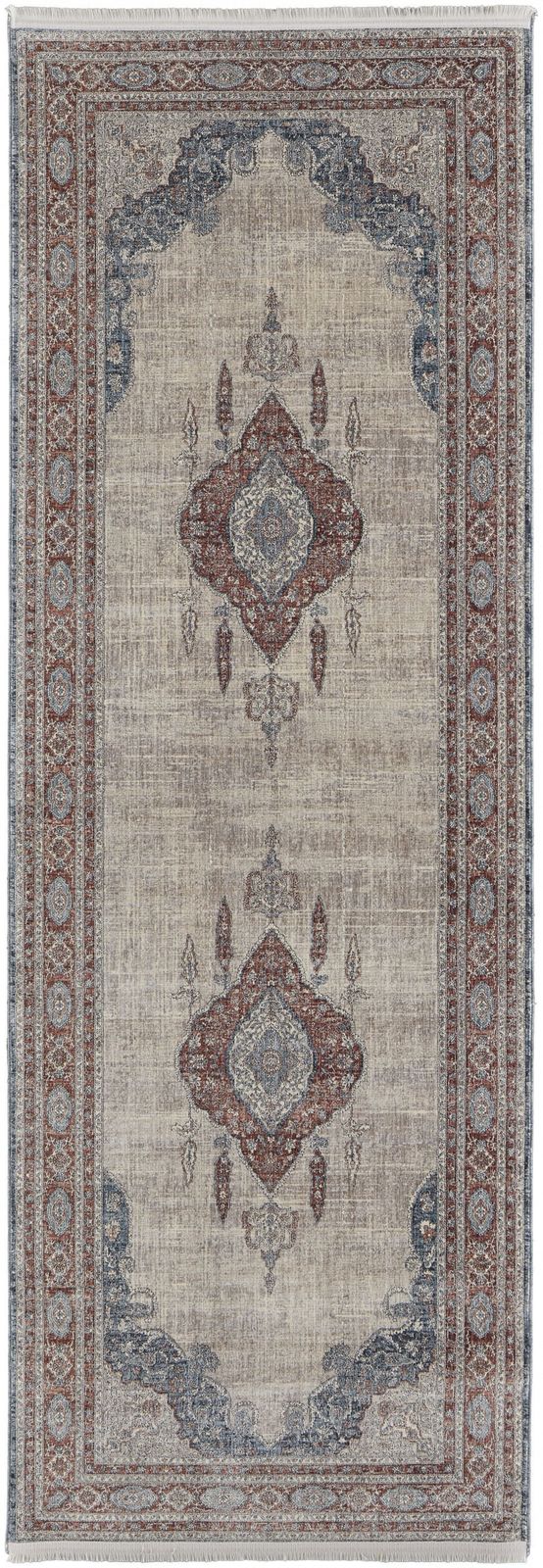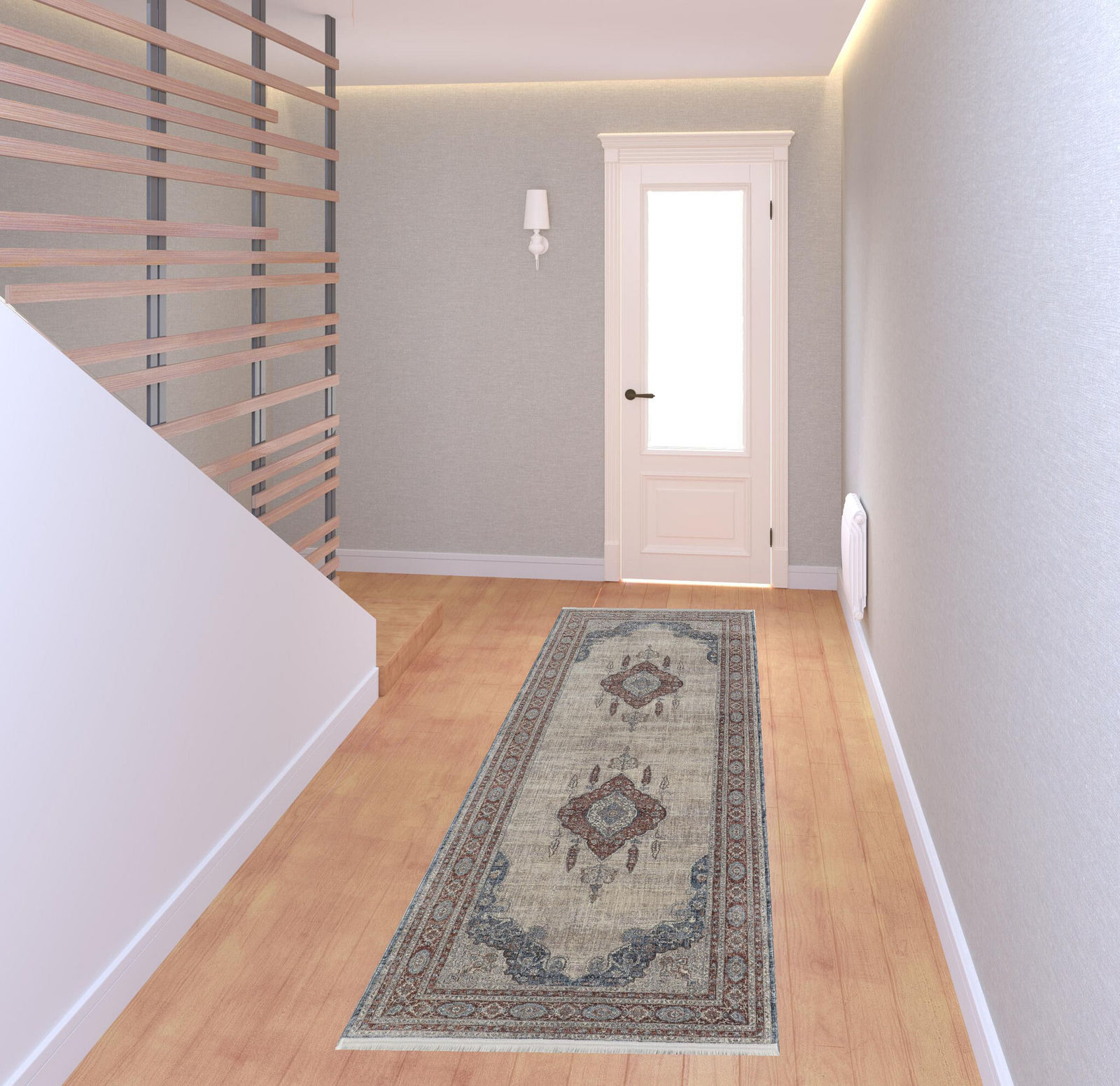 Add great coloration and comfortable texture to your space with this 8-foot blue and gray floral power loom runner rug with fringe. This runner shaped rug features a floral design in blue and gray to give it visual interest. A classic shape marries with good looking design for your space ideal for spaces with kids and pets, this rug is stain resistant to help repel stains and spilled liquids. Tassel ends bring a timeless and fashionable look to your interior. 32-inch H x 96-inch W x 0.25-inch D