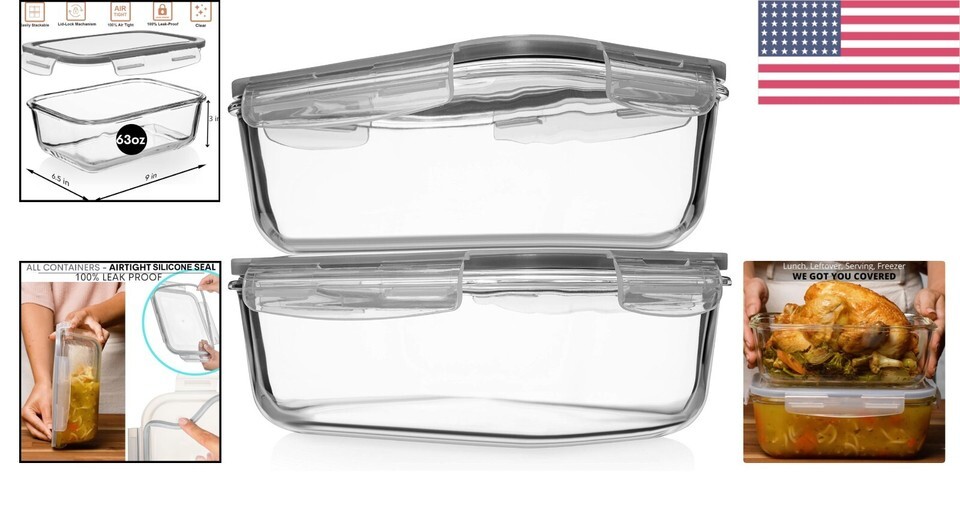 Large family size glass container with airtight locking lids.