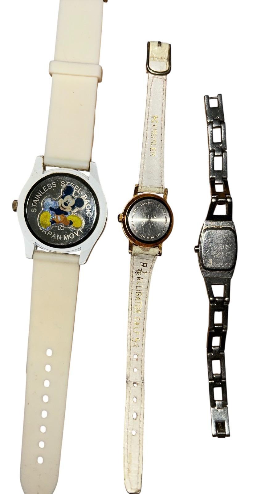 A few nicer watches and some random ones, pictured is what you'll receive. None of them are currently working but probably just a battery or easy fix. Hopefully someone can use them for parts or get them working again! All in pretty good condition. I saw stainless steel on the back of one and quartz on the front of another, I know that doesn't help a lot but bid as you see fit as I can't take returns on "for parts/not working items".