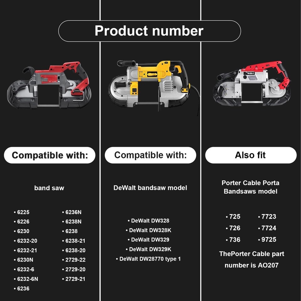 ?Compatibility?Compatible with bandsaw parts 6225 6226 6230 6232-20 6232-21 6230N 6232-6 6232-6N 6236 6236N 6238N 6238 6238-21 6238-20 2729-22 2729-20 2729-21.These tires will also fit Dewalt bandsaw blade DW328 DW328K DW329 DW329K and D28770 type 1.These tires will also fit porter cable band saw parts 725 726 736 7723 7724and 9725. Replacement for band saw pulley tires, electric corded band saws, band saw parts.But not fit cordless portable band saws.