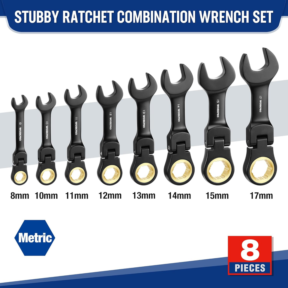- 8-Piece Stubby Flex-Head Ratcheting Wrench Set | Metric 8-17mm | CRV & Pouch