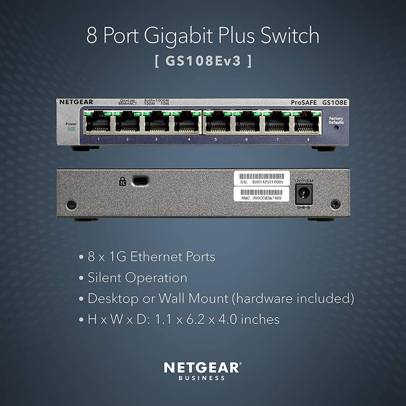 8-Port Gigabit Ethernet plus Switch (Gs108Ev3) - Desktop, and Prosafe L