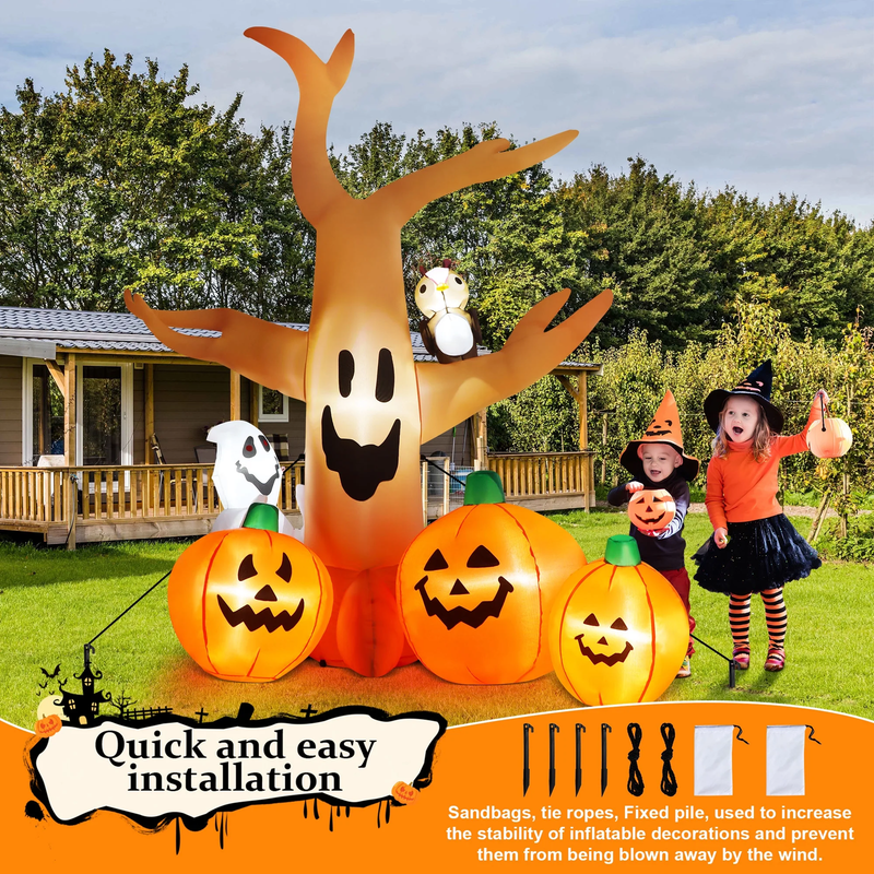 ??Unique Halloween Decoration?: The Halloween inflatable dead tree decoration features a unique design with three pumpkins, a ghost, and an owl. It includes built-in energy-efficient LED lights that illuminate in the dark, significantly enhancing the spooky Halloween atmosphere and making the holiday ambiance more vibrant and enchanting. ??Quick Inflation lasting Expansion?: Our inflatable decoration adapter has undergone rigorous testing and is UL certified. It features a high-speed, low-noise blower that maintains the decoration?s shape consistently and reliably. Installation is quick and easy?just plug it in. We have ensured it meets strict safety standards, so you can use it with confidence. ??Sturdy Stable?: This inflatable tree comes with 4 ground stakes and 2 wind ropes, making it easy to secure to the ground and withstand strong winds. Additionally, it includes 2 heavy-duty sandbags for extra reinforcement. You can anchor it firmly in your yard without worrying about it being blown away. ??Durable Waterproof Material?:The Halloween inflatable decoration is made from high-quality polyester fabric, featuring excellent waterproof and tear-resistant properties. Its waterproof and wind-resistant features make it ideal for outdoor use. The decoration is equipped with bright LED lights that can last throughout the holiday, making it both sturdy and durable. ??Perfect Halloween Decorations?: As a large decoration, the inflatable dead tree effectively enhances the Halloween spooky atmosphere in yards, doorways, and other areas, becoming a highlight of the holiday decor and improving the overall decoration effect. It is easy to install and durable, making it a popular choice and a top pick for Halloween gifts.