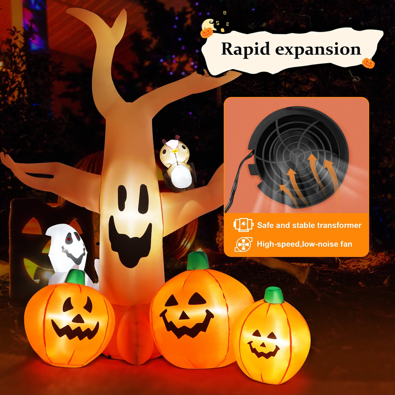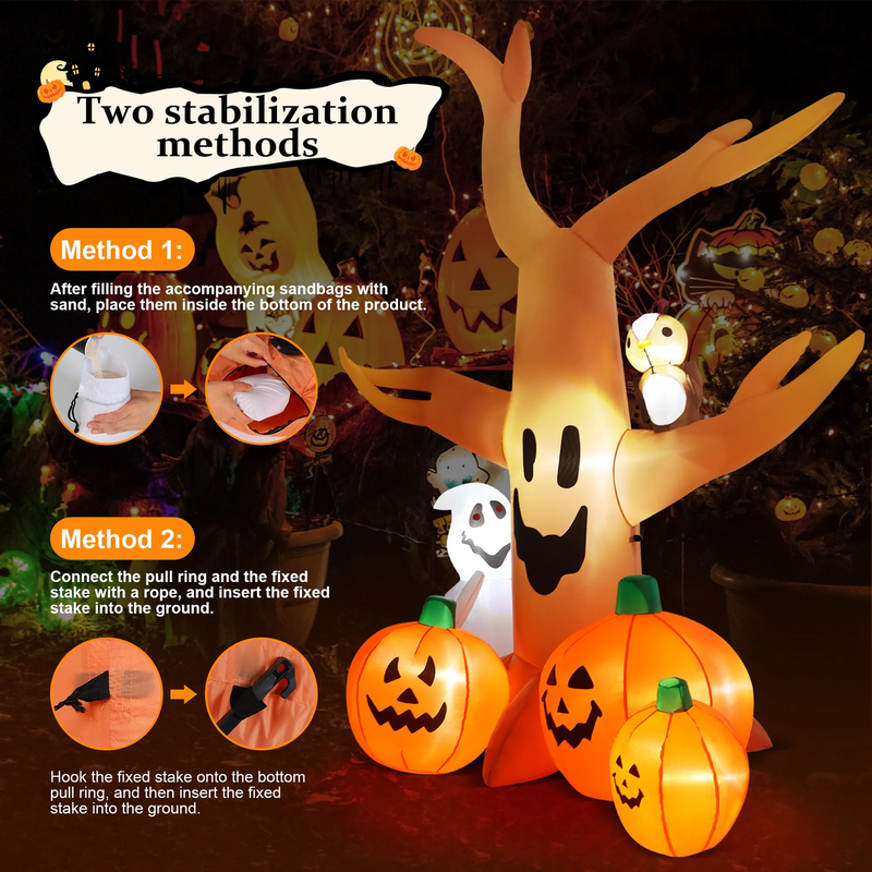 ?Yexmas 8FT inflatable Halloween tree decoration features elements such as pumpkins, ghosts,and owls. Made from high-quality, tear-resistant, waterproof polyester fabric,our Halloween decoration is highly durable and suitable for long-term outdoor use. Outdoor Halloween decor includes two sandbags, three ground stakes, and two ropes, which can effectively withstand wind and rain. Halloween blow ups uses an electric fan for quick and easy setup, and it can be deflated and folded for convenient storage after the holiday. As a large Halloween inflatable, this inflatable dead tree, with its unique appearance, will be the perfect highlight for your Halloween party.