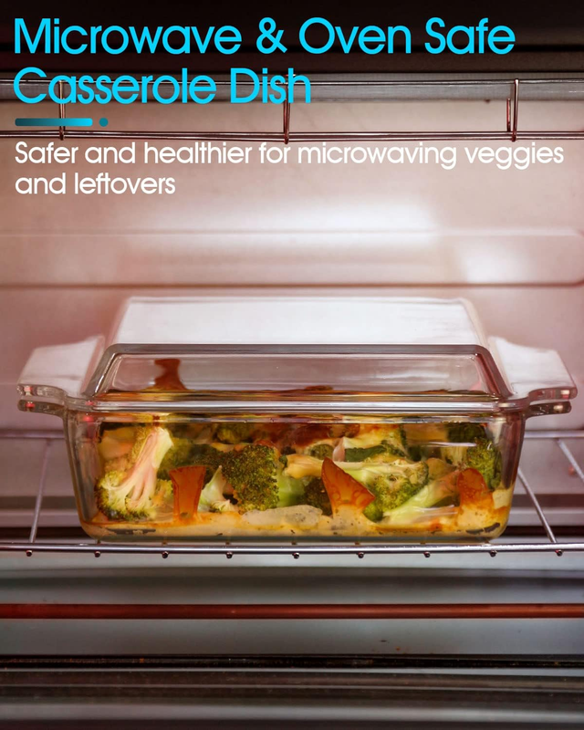 ?Versatile Use?Perfect glass casserole dish with lid for serving and baking casseroles, stews, lasagna, brownies, cookies desserts, spaghetti, chicken, meat, beef, fish, veggies, and all your favorite savory or sweet dishes.