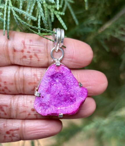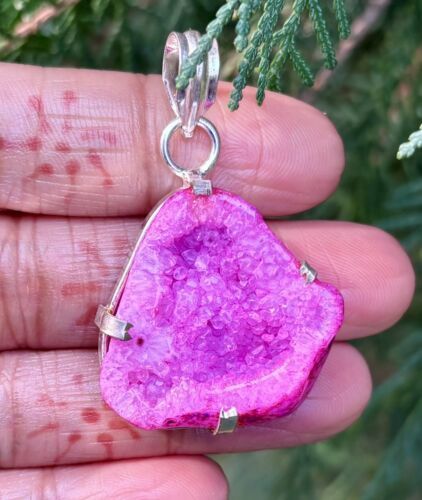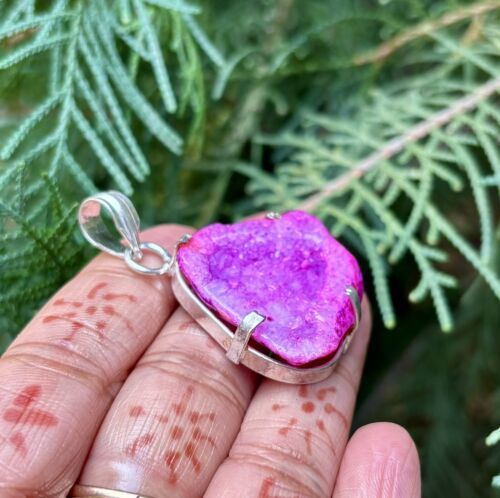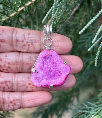 - 925 Sterling Silver Plated, PINK Druzy Geode Agate Stone Pendant, Healing 18