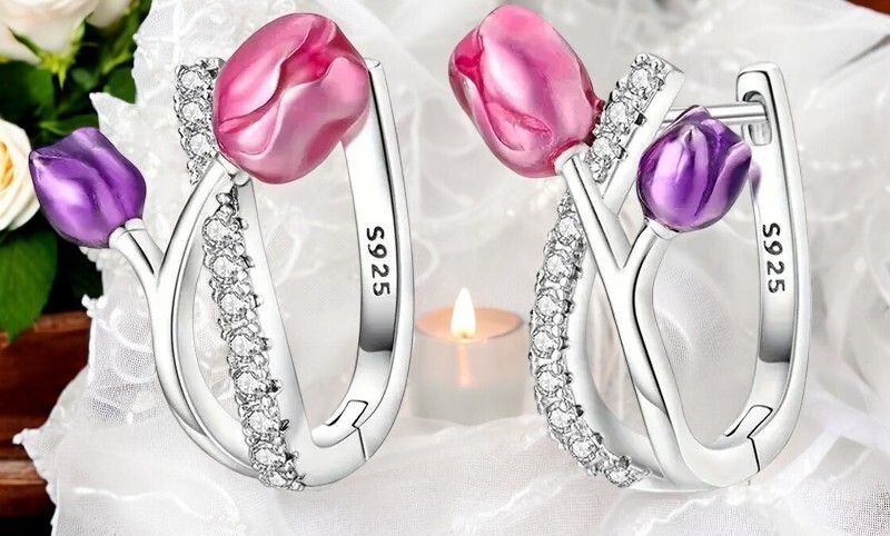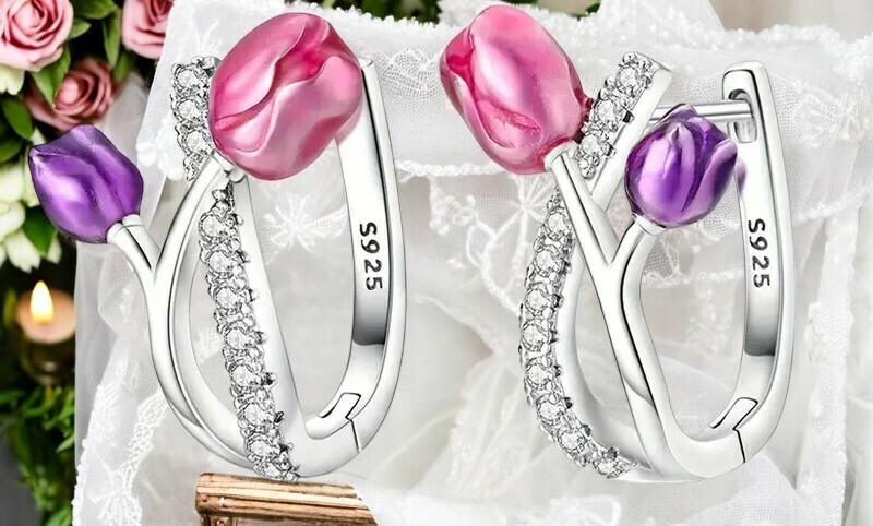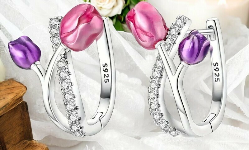 Celebrate elegance with these 925 sterling silver tulip flower earrings, featuring pink and purple blooms accented by sparkling crystals. Their delicate floral design makes them perfect for any occasion ? from weddings to everyday wear.