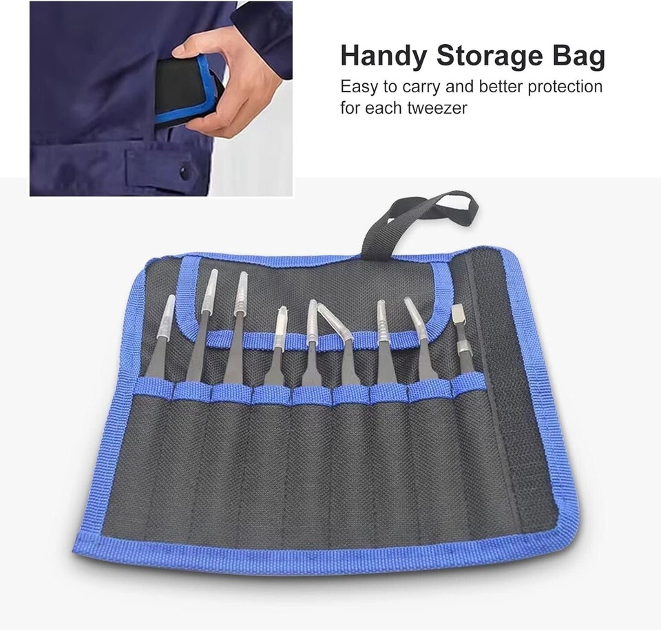 With a sleek professional canvas storage bag that makes both organizing and transporting a breeze, this precision tweezers set is not just a tool ? it?s an essential companion for every hobbyist and professional alike. Elevate your craft and precision work today with our meticulously designed tweezers set!
