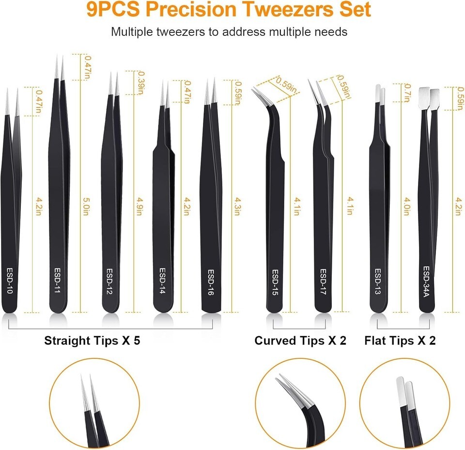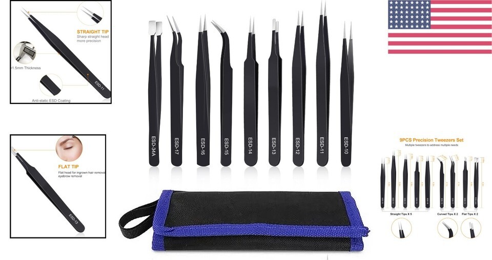 - 9PCS Precision Stainless Steel Tweezers Set - ESD Safe for Electronics & Craft