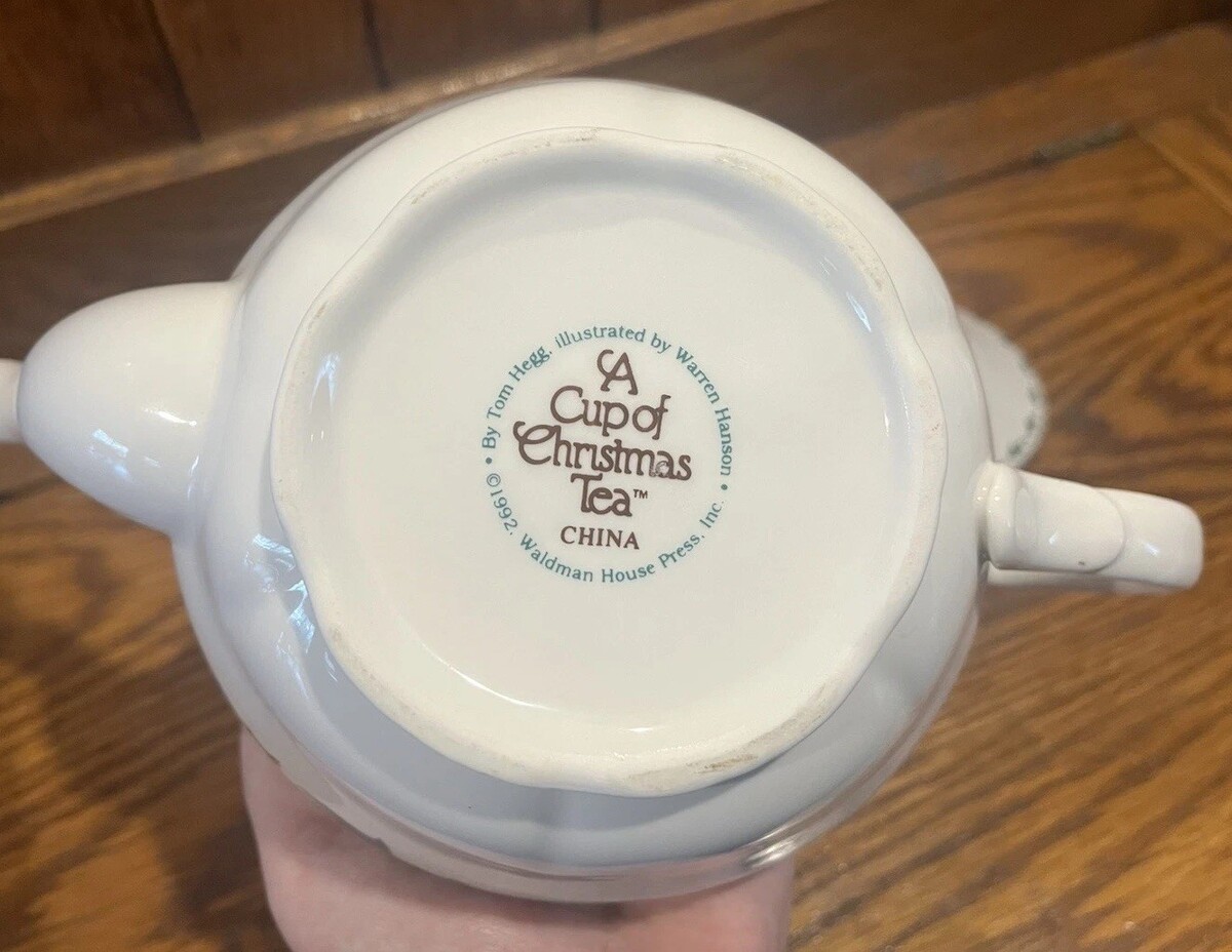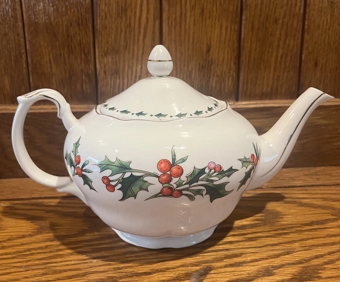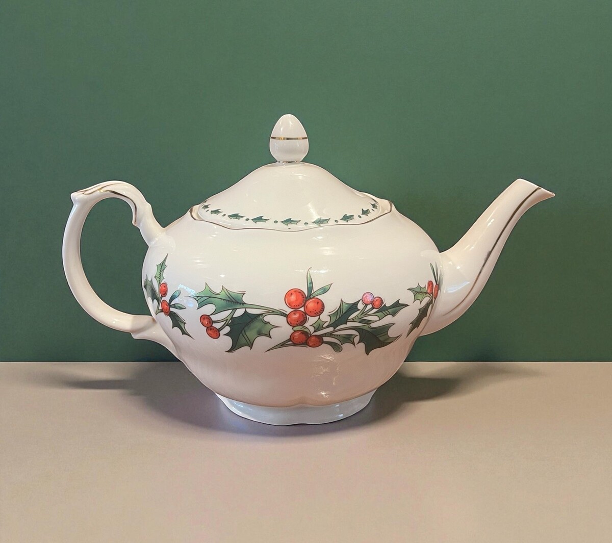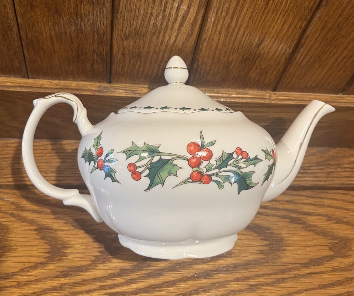 A Cup of Christmas Tea Teapot Holly Berry Gold Trim 1992 Vintage Waldman House