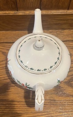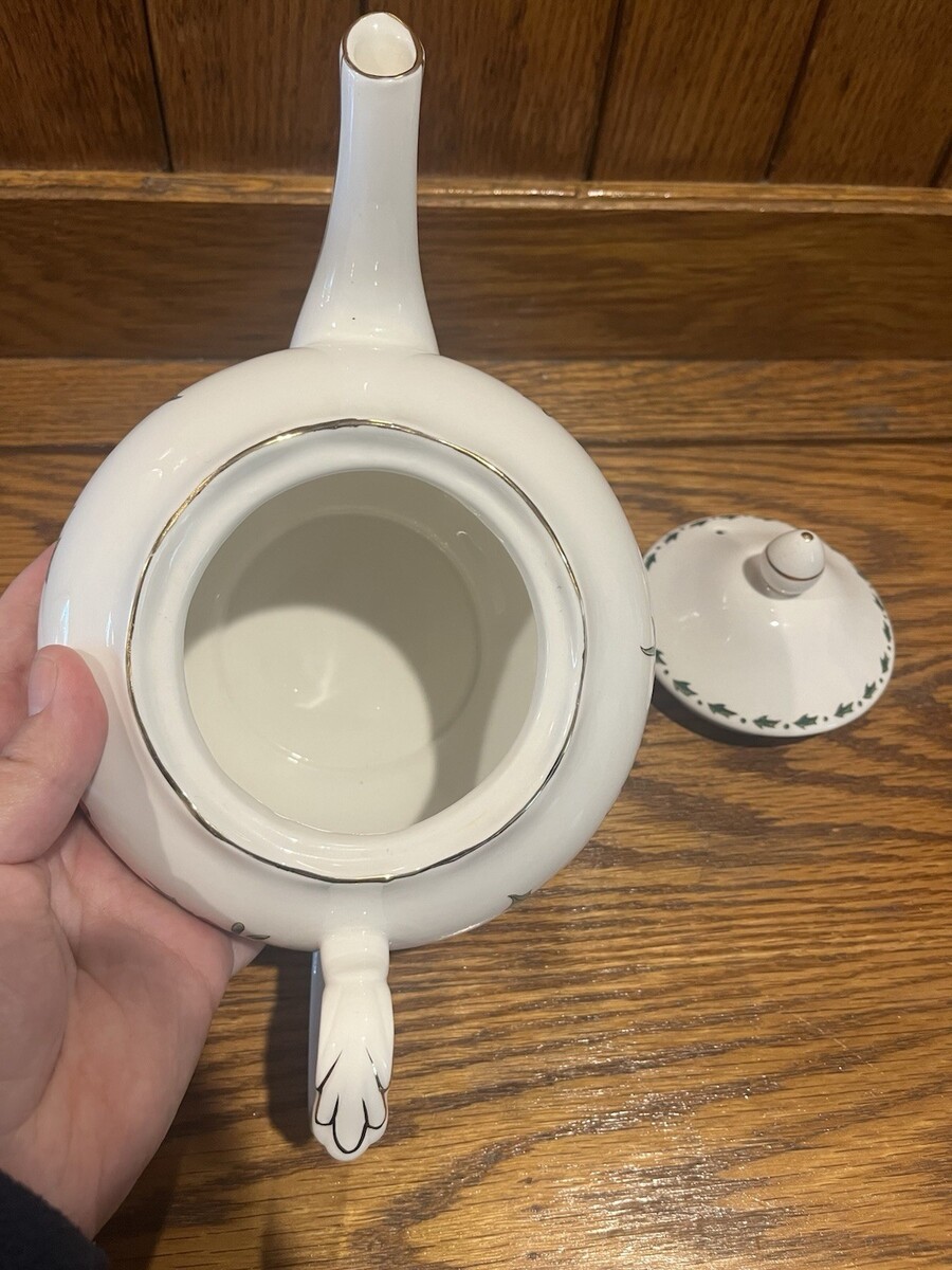 This vintage Waldman House teapot, made of ceramic with a glossy finish, features a holly berry pattern and gold trim, adding a touch of Christmas charm to your home. With a medium size capacity of 1 qt, this teapot is perfect for serving tea during the holiday season. The white color, Victorian style, and seasonal theme make it a collectible piece that will delight any tea lover or collector of festive kitchen decor. Please let me know if you have any questions!