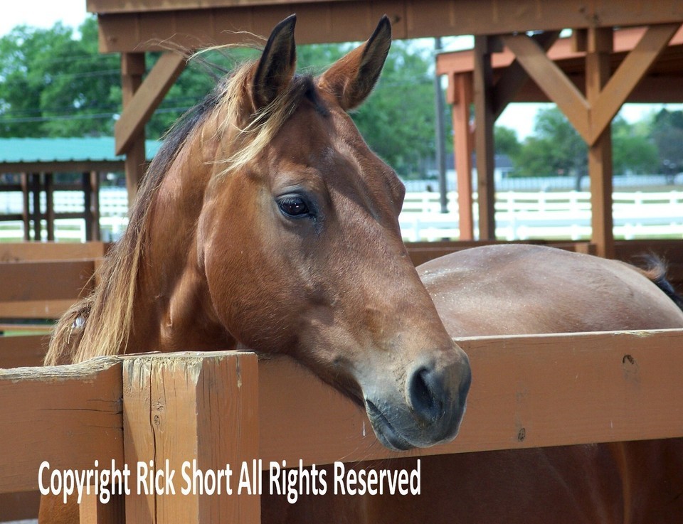 Horse portrait of a side view of a horse in its fenced in stall in Ocala, Florida. Full color 11" x 14" image on glossy paper. Mint Condition, comes packaged in a rolled up mailer tube. Photographed by Rick Short. Copyright, All Rights Reserved.