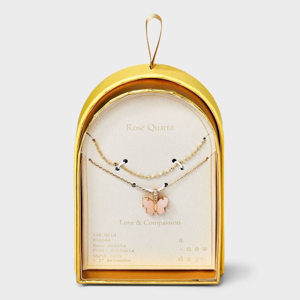 Add a beautiful finishing touch to your going-out looks with the 14K Gold Dipped Cubic Zirconia Rose Quartz Butterfly Pendant Multi-Strand Necklace from A New Day?. This 14K gold-dipped necklace features two chains in assorted styles accented with a cubic zirconia rose quartz butterfly pendant for a fantastic look you'll love flaunting. Designed with a lobster claw clasp closure and a three-inch extender chain for a customizable fit, this nickel-free necklace suits most skin types and comes in a golden box for convenient gifting. A New Day?: Style that goes wherever you do.