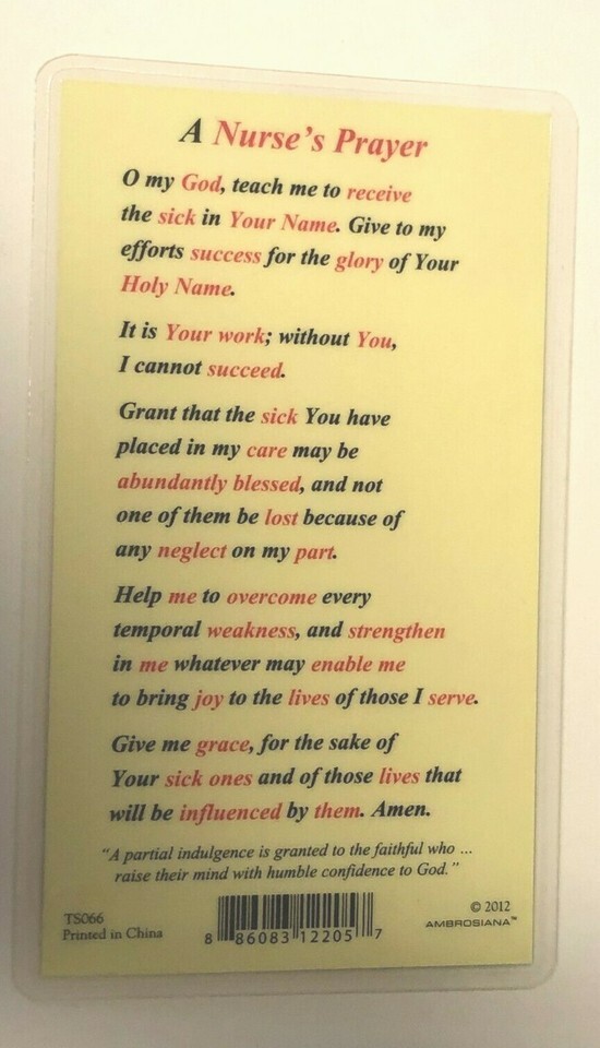 You are purchasing a beautiful prayer for Nurse's. This is a laminated card that comes from the Gerffert collection. The picture doesn't reflect how nice it really is. It has a gold border around the outside of the image of Our Lady. It measures approximately: 4.25" x 2.50".