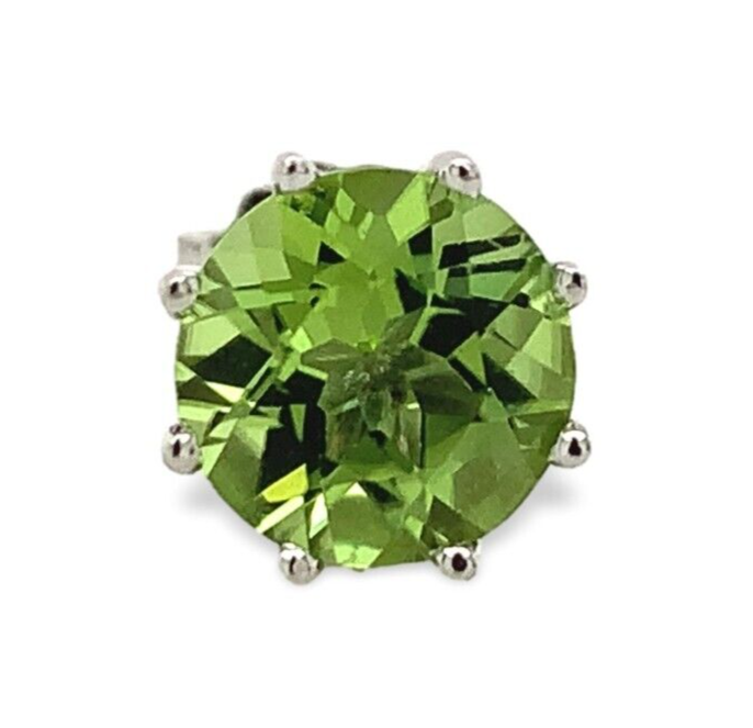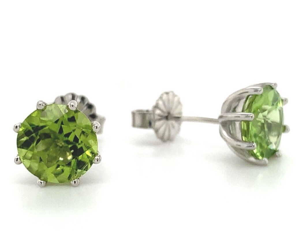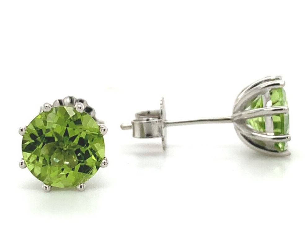 A pair of platinum peridot stud earrings. The round brilliant cut peridot stones measure about 7mm and weighs 2.81 carats total. They are a bright apple green color. The peridots are set in an eight prong basket. They measure about 5/16", and the pair weighs 1.50 dwt. They are new. Delightful!