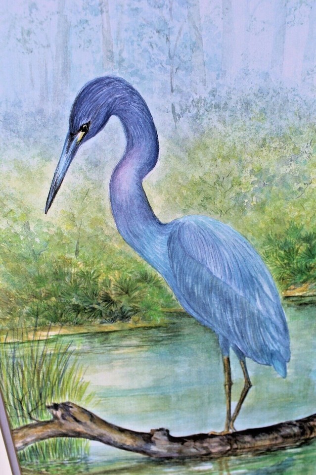 Renderings of indigenous bird in its natural settings. This print is unique in colors of green and blue. Print itself measures 17? tall X 11" wide NOTE: This sale does not include a frame: print is stuck on a matting board and the white matting which measures 19" wide by 24" tall.