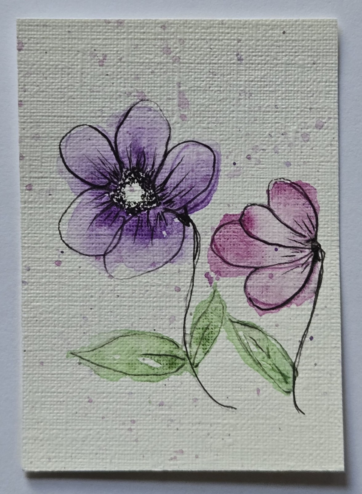 ACEO Original Art Pink Purple Flowers Ink & Watercolor Painting on Paper