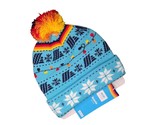 Stay cozy and stylish with this charming winter beanie featuring a delightful Nordic-inspired pattern. The light blue base showcases white snowflakes, navy trees, and a festive string of multicolored lights design. Topped with a vibrant rainbow pom-pom that adds a playful touch. Perfect for winter activities, holiday celebrations, ski trips, or simply brightening up chilly days. The knit material provides warmth while the cheerful design spreads winter joy.