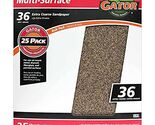 Product Description Multi-purpose aluminum oxide sandpaper provides excellent performance at a value price. These sheets are ideal for both hand and power tool sanding on wood, metal, fiberglass and painted surfaces. Aluminum oxide is a durable grain that is recommended by professionals for general sanding a wide variety of surfaces. From the Manufacturer Gator Grit 25 Count 9" x 11" 36 Grit Extra Coarse Multi-Surface Sandpaper. These multi-surface sandpapers are ideal for use on wood, metal, drywall, fiberglass or painted surfaces. The sheets can be used for hand or machine sanding. They can be cut into 1/2 sheet, 1/3 sheet, or 1/4 sheet to fit orbital sanders.