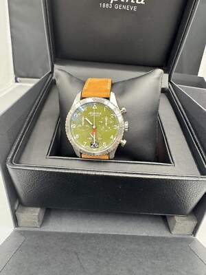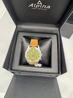 ALPINA Men's Startimer Chronograph Big Date Swiss Made Quartz Stainless Steel Case with Brown Leather Strap Watch The Alpina Startimer Pilot Quartz Chronograph Big Date, inspired by its heritage look and incomparable precision. Features a 41mm black PVD stainless steel case with the case back engraved with an airplane about to fly over a mountain. The green dial has white indexes, the date at 6 o'clock and a bicompax chronograph, ideal for calculating flight times as it is able to measure to the 10th of a second, set on a brown leather pin buckle strap. Anti-Reflective Sapphire Crystal 100M Water Resistant