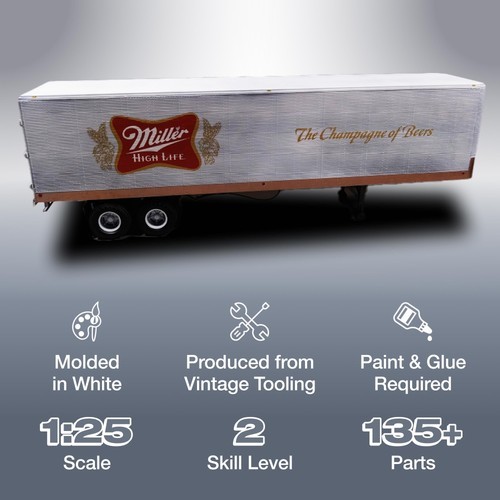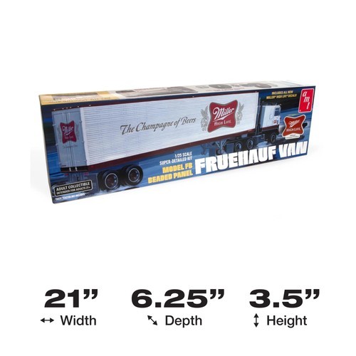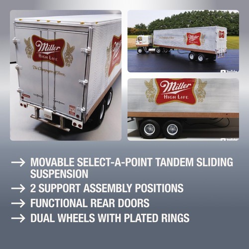 BIG ON DETAIL: Loaded with authentic details, the Fruehauf Van includes: movable select-a-point tandem sliding suspension, 2 support assembly positions, functional rear doors, dual wheels with plated rings and more! Fully paintable, with ALL NEW Miller High Life water-slide decals and vintage-style packaging which will WOW your friends!
