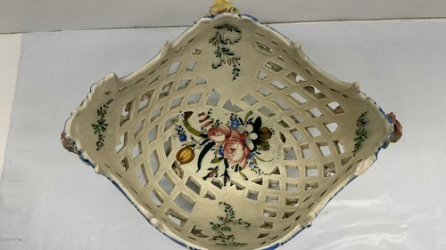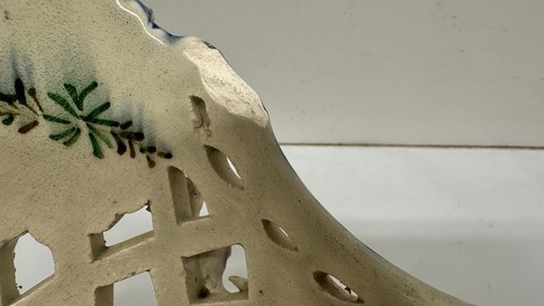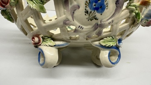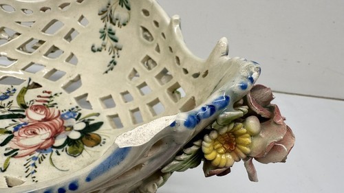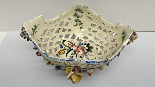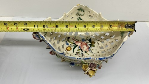 Has a chip on the rim as shown in pics. This antique large bowl centerpiece is made in Italy, potentially by Capodimonte, known for its exquisite ceramic and porcelain creations. The stunning piece features intricate molded floral designs, showcasing a vibrant multicolor palette typical of antique Italian craftsmanship. With an unmistakable antique style, this original piece exudes elegance and charm, making it a captivating addition to any collection or decorative display. Its exact age is unspecified, adding to the allure and mystery of this beautiful Italian-made centerpiece.