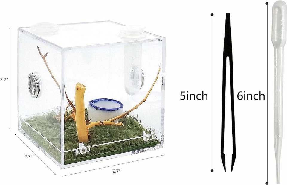 Package include 1 small spider cage(2.72.72.7inch), 1 simulated turf,1 ceramics bowl, 1 dropper,1 tweezer,1 Driftwood. Suitable for arboreal tarantulas, crickets, snails, praying mantis, spiders, scorpions, praying mantis, house lizards, frogs, corn snakes, beetles, hermit crabs and other small insects.