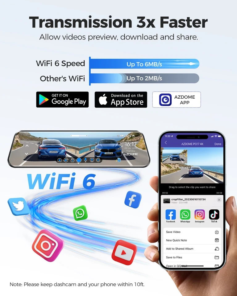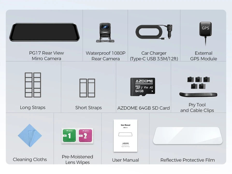 AZDOME 12" Rear View Mirror Camera 4K+1080P GPS WiFi Front and Rear 64GB SD Card