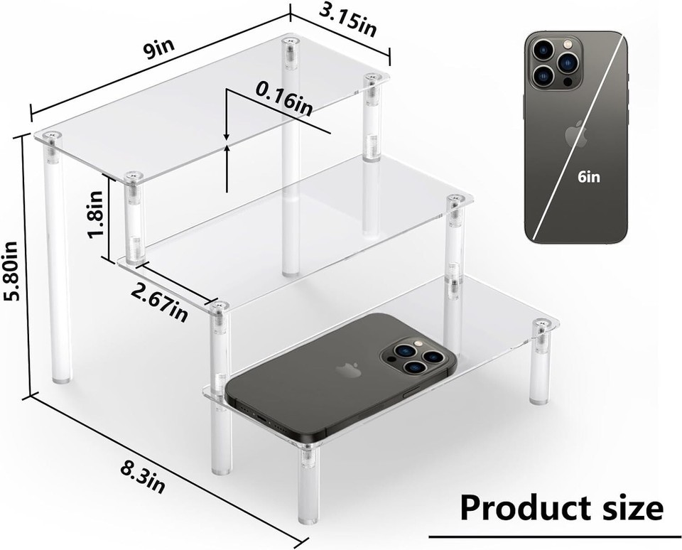 ??SIZE?:SIZE: Every Acrylic Panel Is 9" Long And 3" Wide, The Height Of Each Tier Is 1.9", The Total Height Is 5.7". Each tier can display a maximum of 3 Figures with a diameter of 2.5 inches or 4 cupcakes with a diameter of 2 inches or perfume bottles with a bottom size not exceeding 3" x 8". Please make sure to confirm the dimensions before making a purchase!