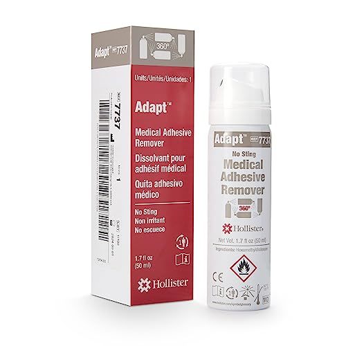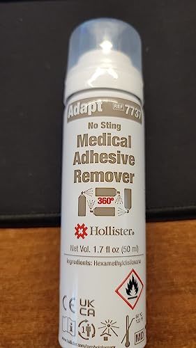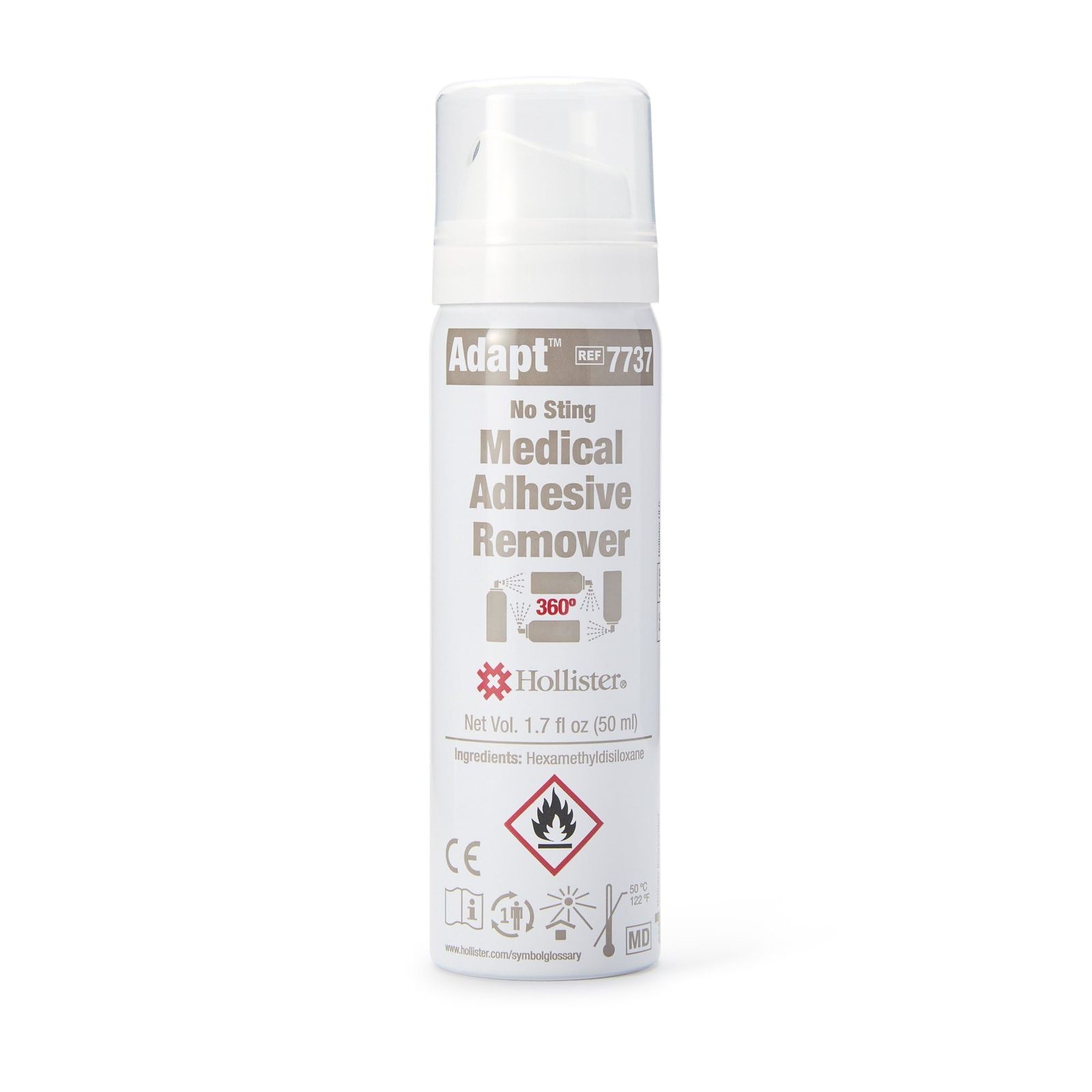 Product description: Adapt Adhesive Remover Spray Spray 50 mL, 7737 - EACH. Brand: Adapt. Manufacturer Name: Hollister. Manufacturer Number: 7737. Application: Adhesive Remover. Container Type: Can. Form: Spray. Volume: 50 mL. SOLD BY: EACH. Adapt medical adhesive remover spray with its silicone-based, alcohol-free formulation delivers an efficient solution for barrier removal without the sting caused by alcohol No sting from alcohol Contains no CFCs 360 Spray can