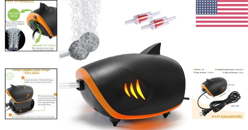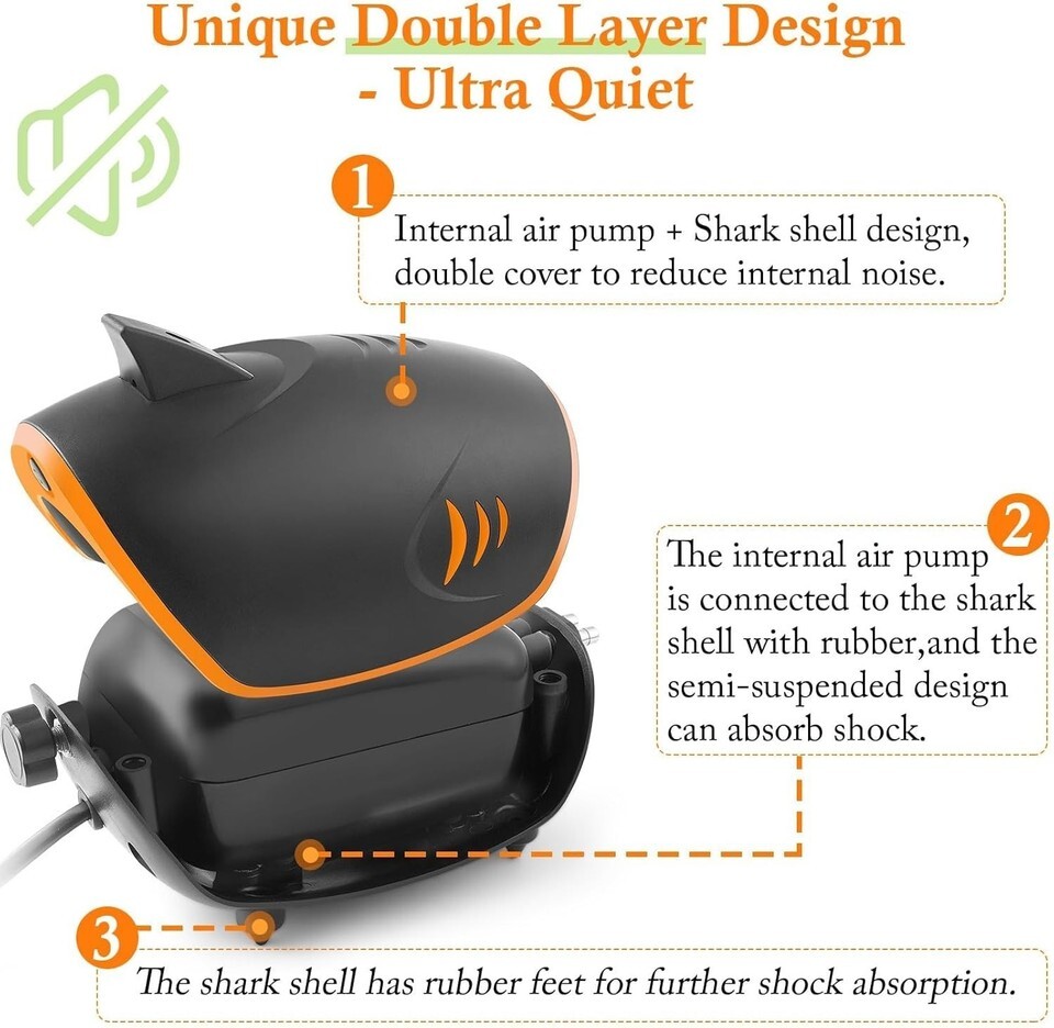 If you?re seeking a reliable and stylish solution for enhancing your aquarium experience, look no further than our Adjustable 110GPH Aquarium Air Pump. With a striking shark-inspired design and captivating LED illumination, this pump not only functions flawlessly but also adds a delightful charm to your fish tank.